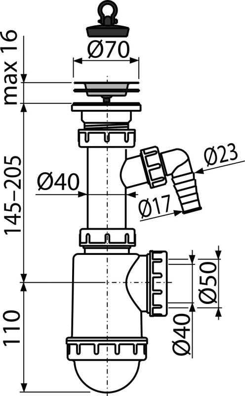 - Возможность подключения канализационной трубы Ø50 или Ø40 мм